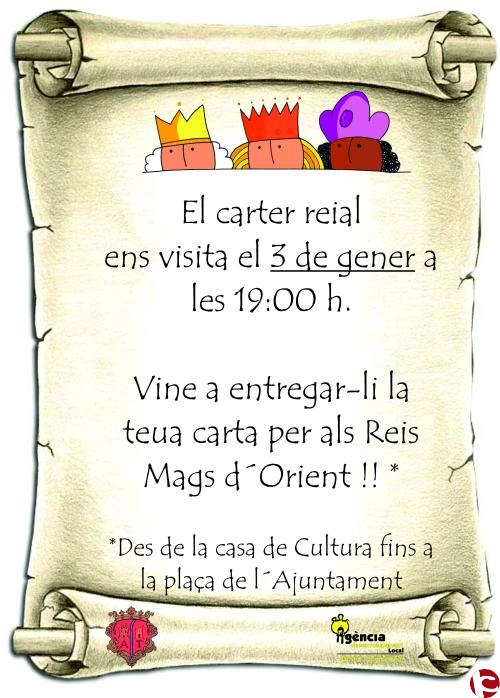 El cartero real visitó la población de Agost ayer, 3 de enero a las 19:00 h. Los niños fueron a entregar sus cartas para los Reyes Magos de Oriente. El acto se llevó a cabo desde la Casa de Cultura hasta la plaza del Ayuntamiento .