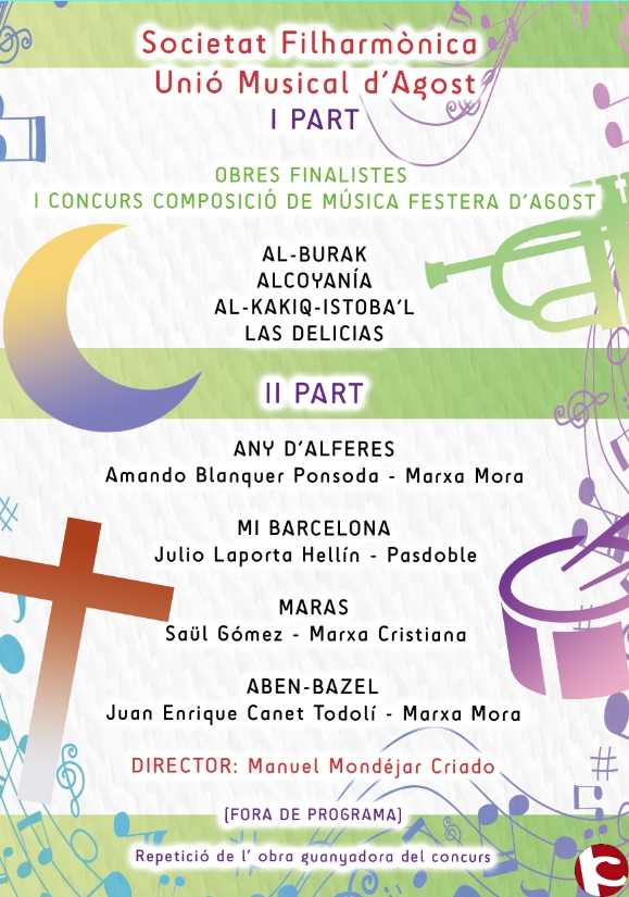 El pròxim 30 de juliol tindrà lloc a Agost l’I Concurs de composició de música festera, a les 20:30h en l’Auditori Municipal, on podrem gaudir de les interpretacions de les obres finalistes, per a conèixer finalment als guanyadors d’aquest primer certamen.
