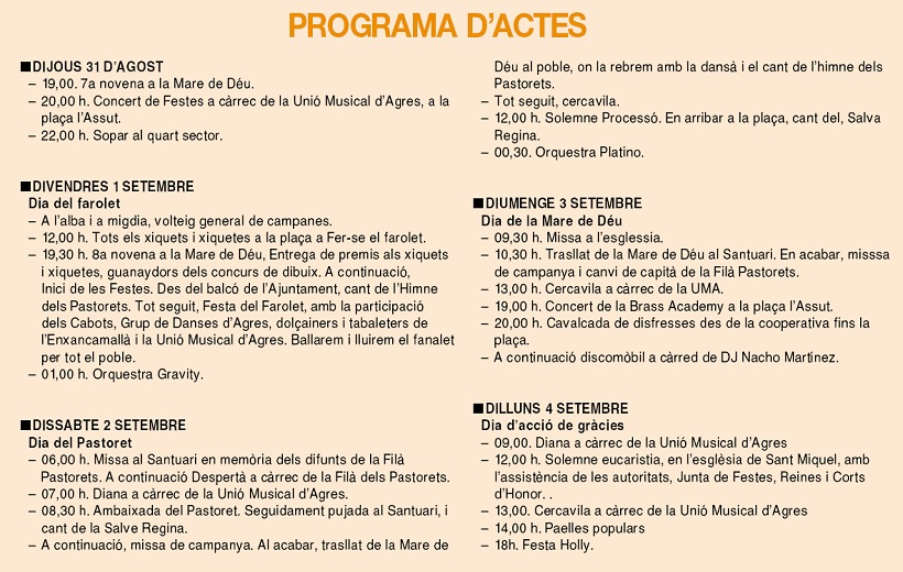 - ‘DIA DE LA MARE DE DÉU D’AGRES: Se celebra el primer diumenge del mes de setembre. Durant el qual diversos oficis religiosos celebren el dia de la Verge.
