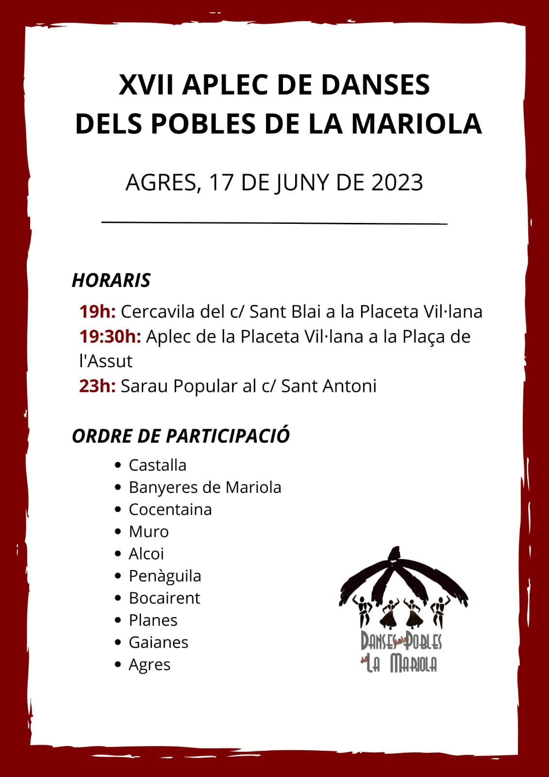 El XVII Aplec de Danses dels Pobles de la Mariola plenarà els carrers d´Agres el proper dissabte 17 de juny. Cercavila, Aplec, actuacions i per finalitzar, Sarau Popular.