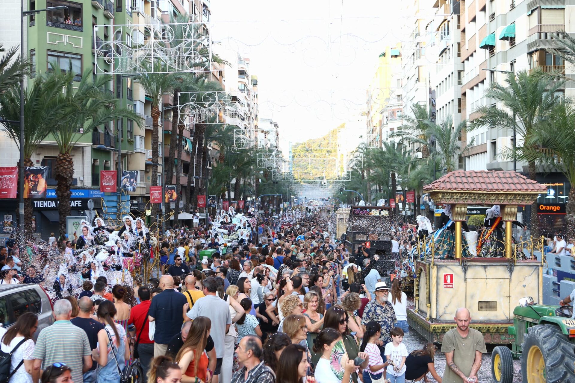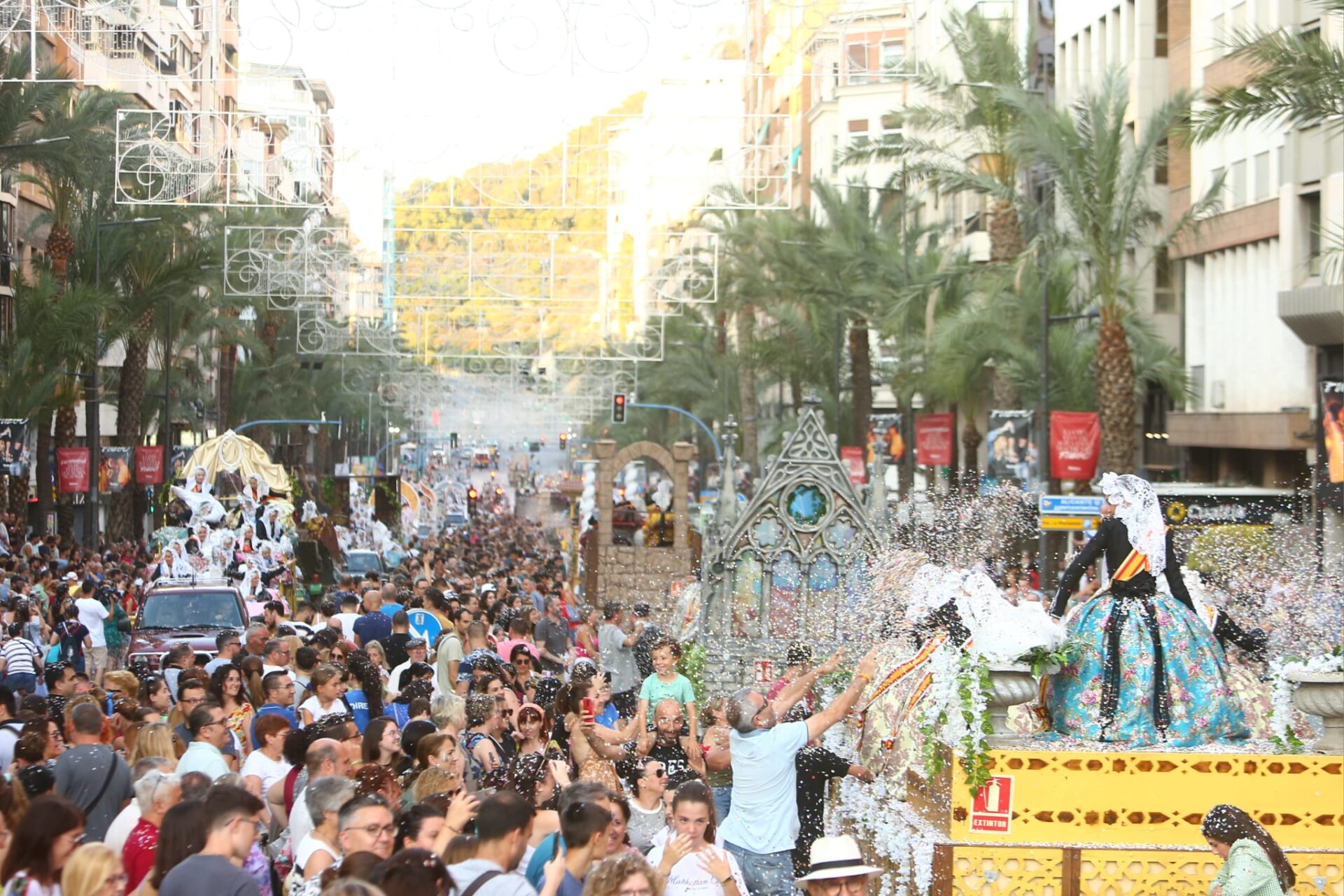 Más de 2.000 kilos de confeti han volado por Alfonso el Sabio desde las 34 carrozas en las que han desfilado las bellezas y damas adultas e infantiles de las diferentes hogueras y las belleses del foc y sus damas.