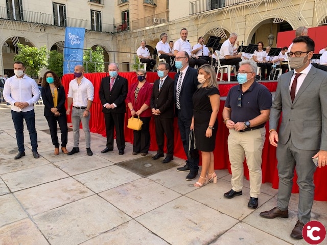 Alicante, 9 de octubre de 2020.- La vicealcaldesa de Alicante, Mª Carmen Sánchez, ha presidido hoy los actos conmemorativos del 9 pd´Octubre que se han desarrollado en la Plaza del Ayuntamiento, con las preceptivas medidas de seguridad derivadas del COVID-19. La edil ha estado acompañado por parte del equipo de gobierno de los concejales Manuel Villar, Antonio Manresa y Adrián Santos, además de otros miembros de la corporación municipal. La Banda Sinfónica Municipal, dirigida por Pedro Lara, ha interpretado piezas del folclore de la Comunidad -Lo cant del valencià (Pedro Sosa), Es chopá… hasta la moma (Salvador Giner), La millor terra del món (Ernesto Rosillo), Tres dançes valencianes (Amando Blanquer) y La Flor del Taronger (Miguel Asíns). La actuación de la Banda ha finalizado con las interpretaciones de los himnos de Alicante, Comunidad Valenciana y España.