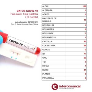 Actualización de datos en los municipios de las comarcas del Alto y Medio Vinalopó, L’Alacantí, la Foia de Castalla, la Foia d’Alcoi y El Comtat. PCR’s positivas de los últimos 14 días, con fecha del 22 de agosto de 2021.