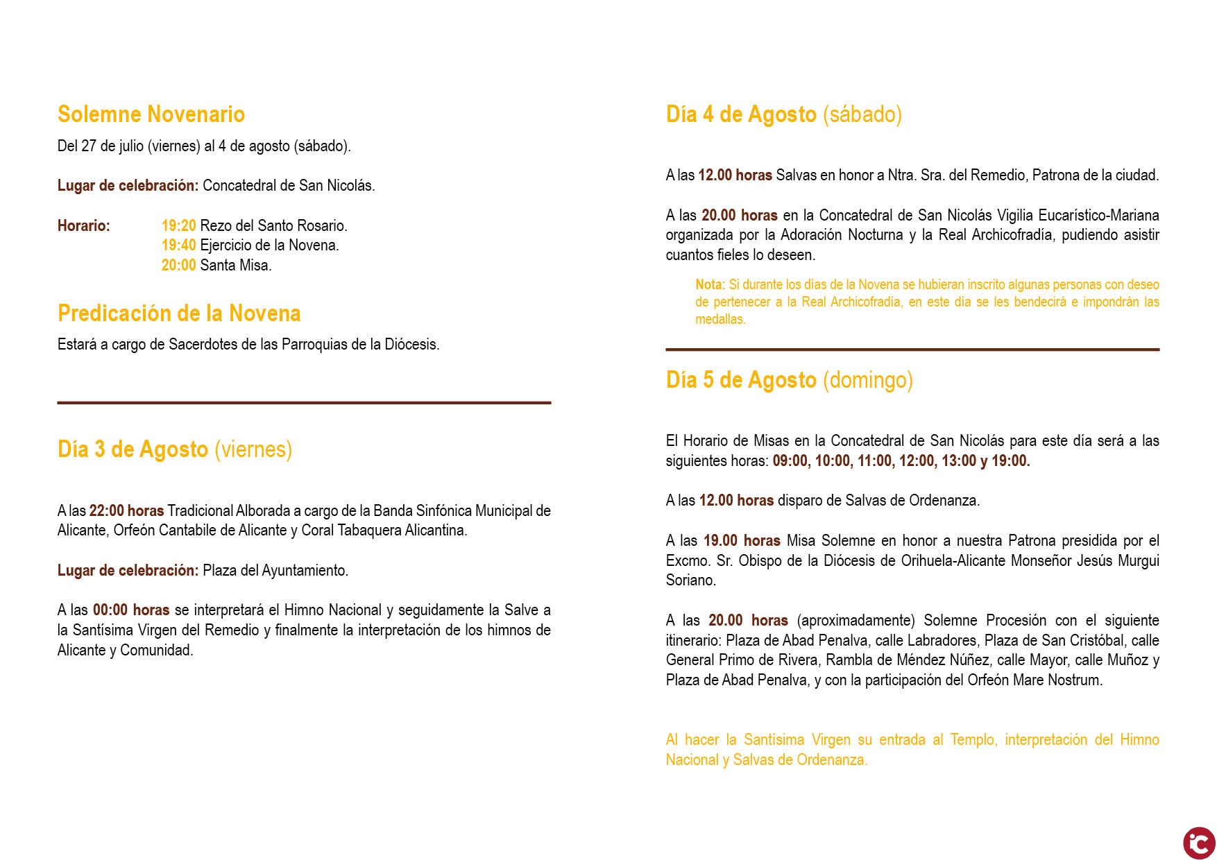 Alicante celebra este fin de semana sus Fiestas en honor a la Virgen del Remedio, Patrona de la ciudad, con una serie de actos conmemorativos que comenzarán el viernes 3 de agosto a partir de las 22 horas con la Tradicional Alborada a cargo de la Banda Sinfónica Municipal de Alicante, Orfeón Cantabile de Alicante y la Coral Tabaquera Alicantina, y que tendrá lugar en la plaza del Ayuntamiento.