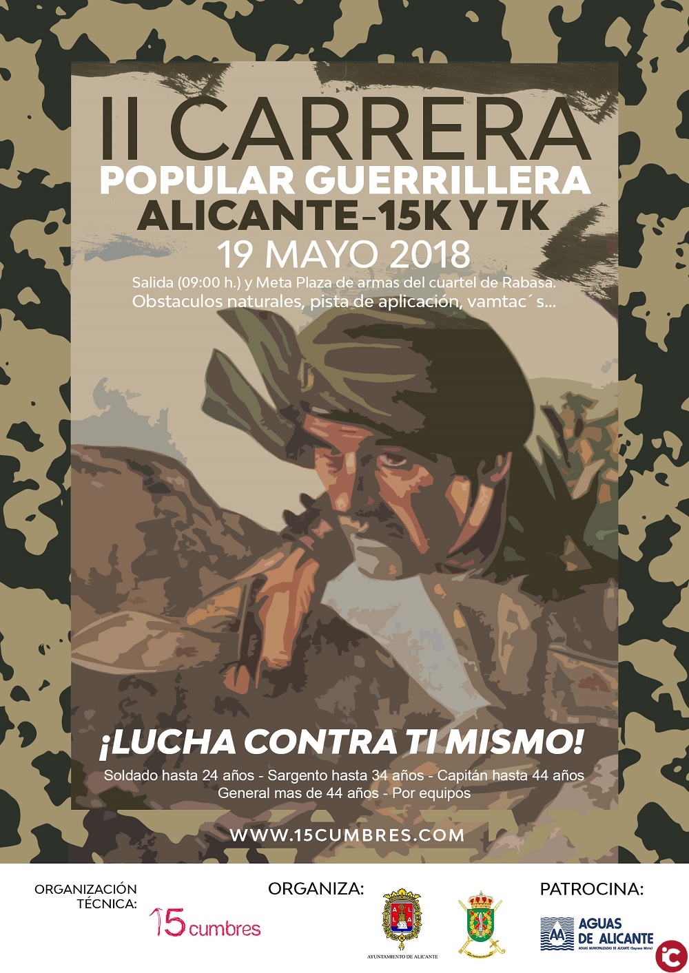 El Ayuntamiento de Alicante en colaboración con el Mando de Operaciones Especiales y el club de atletismo 15 Cumbres, van a celebrar el próximo sábado 19 de mayo la II Carrera Popular Guerrillera en la plaza de armas del Cuartel de Rabasa, donde se espera que cerca de 700 participantes se den cita para enfrentar las pruebas de 7k y 15k que este año cuentan con más obstáculos, aumentando así la complejidad del recorrido.