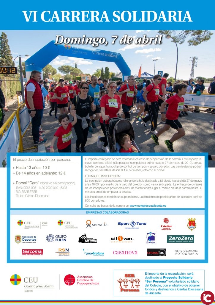 Por sexto año consecutivo el colegio alicantino, junto con el Ayuntamiento de Alicante, consiguen reunir a alumnos, padres y aficionados al running en un evento solidario. La salida tendrá lugar en el parking del colegio CEU Jesús María, a las 9:30 horas para el inicio de los 10k y a las 11:00 horas para los 5k.