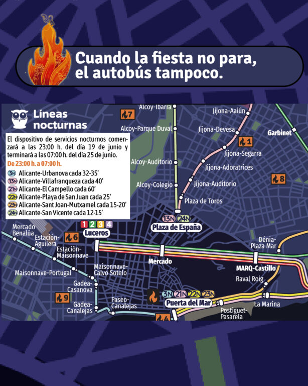 El resto de líneas que también se vean afectadas por la presencia de monumentos fogueriles, barracas, racós o calles adornadas, también tendrán sus oportunos desvíos, de los que se informará puntualmente por el operador del servicio a través de su web https://alicante.vectalia.es/