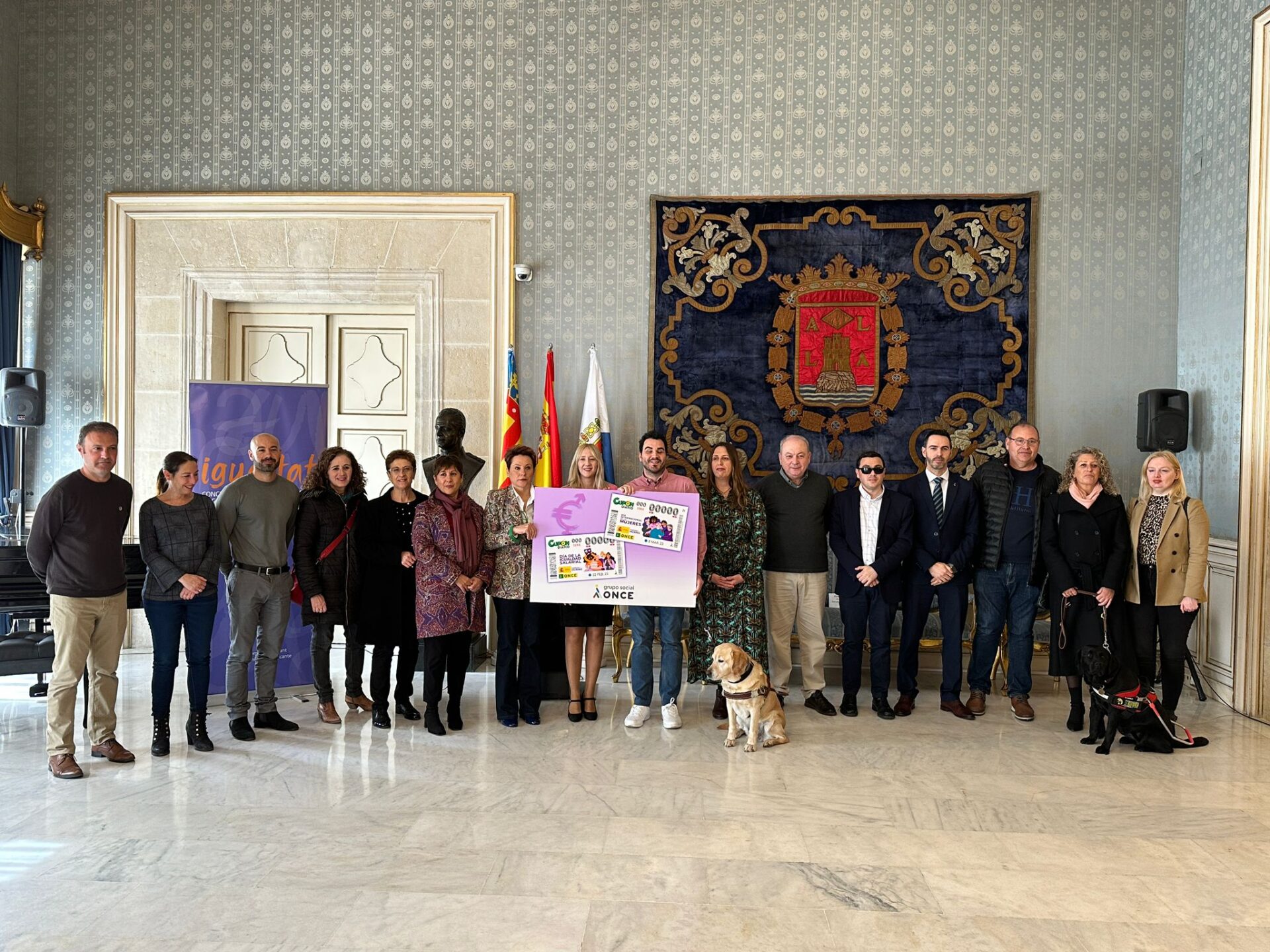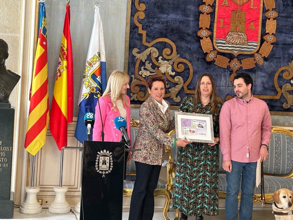 Alicante, 6 de marzo de 2023. El grupo social ONCE ha presentado este lunes en el Ayuntamiento de Alicante su iniciativa de poner a la venta diez millones de cupones con una doble reivindicación, la igualdad y el fin de la brecha salarial entre hombres y mujeres, con motivo de la próxima celebración del 8 de marzo, Día Internacional de la Mujer, y del pasado 22 de febrero, Día de la Igualdad Salarial. La concejal de Igualdad, María Conejero, ha recibido una réplica de estos cupones.