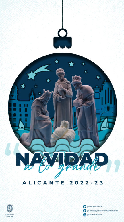 El concejal de Fiestas, Manuel Jiménez, ha explicado que “se ha confeccionado un amplio y completo programa, con la participación de distintas concejalías, para que la Navidad vuelva a estar presente en todos los puntos de Alicante. Serán unas fiestas, aunque con las lógicas precauciones, como las que vivimos antes de que la pandemia nos azotara. El conjunto de actividades nos hará retroceder en el tiempo a las Navidades de siempre, a las tradicionales”. La “Navidad a lo Grande” 2022-23 se anuncia con un cartel original del diseñador alicantino Kike Torres. Se han editado 20.000 ejemplares de un programa de mano en castellano, valenciano e inglés.