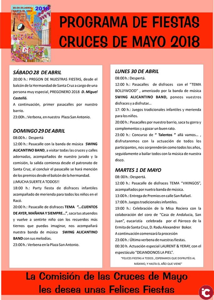 Como cada año, la Comisión de las Cruces de Mayo de Alicante celebra este fin de semana y hasta el 1 de mayo su Fiesta Tradicional en la que se podrá disfrutar de actuaciones musicales, pasacalles y actividades tanto para los vecinos como los visitantes, y de entre las que se destaca el concurso de decoración de calles.