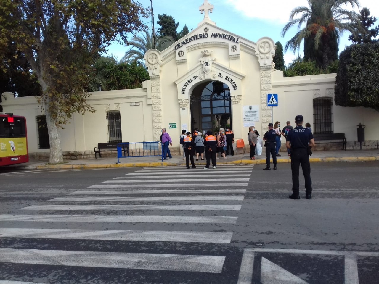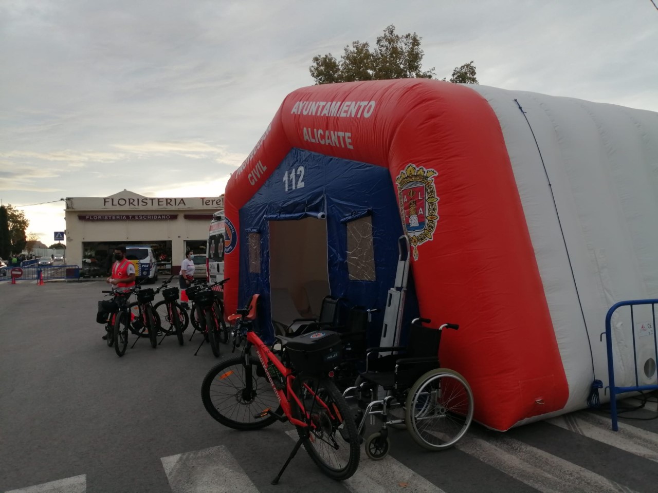 Desde primera hora, los cuerpos de seguridad municipales han comenzado a volar el Dron para evitar aglomeraciones, así como situaron voluntarios de Protección Civil con gel y agentes de Policía en los accesos para asegurar que se accediera con mascarilla y sin producirse agrupaciones, controlando a su vez el recinto patrullando a pie y con bicicletas. En la entrada se estableció una carpa hospital y un puesto de mando avanzado, para velar por la seguridad y protección de los alicantinos que se han desplazado al camposanto.