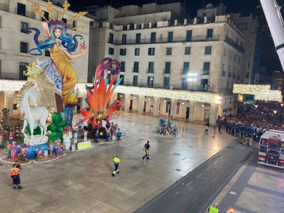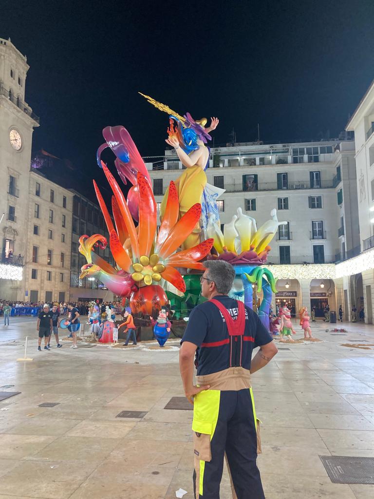 Hermanos Sirvent se ajusta a la estructura de la Hoguera Oficial adulta para que comience a arder por las bases y marque el inicio de la Nit del Foc por todo Alicante