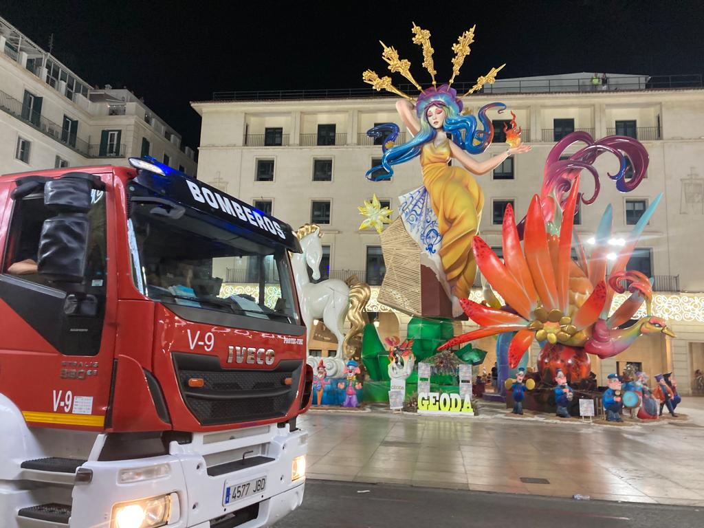 Con ‘D’ Alacant, al món’ convertida en ceniza, ha comenzado el espectáculo pirotécnico previo a la cremà de ‘Geoda’, que ha sorprendidoal numeroso público que ha abarrotado el perímetro de seguridad de la Plaza del Ayuntamiento. Pedro Luis Sirvent, gerente de Hermanos Sirvent, ha apostado por una cremá con un triple sistema de fuegos «para que comience a arder de forma simultánea». Éstos, debido a la estructura de la hoguera que Sirvent había estudiado en los últimos días, los ha situado en la estructura central, en el caballo alusivo a los de la Plaza de los Luceros, y en el Ave Fénix.