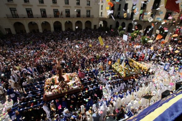 Al salir de la basílica, una colla ha interpretado una composición dedicada a ella, y en su honor se ha bailado una dançà. En el interior del templo ha habido una levantà en recuerdo de José María Lorente Satoca, uno de los fundadores de la hermandad. La procesió ha enfilado la escalinata que da acceso a la calle Jorge Juan a los compases del pasodoble ‘José Ángel Guirao’. Los costaleros han vestido el traje de zaragüells, fajín y pañuelo azul. Las Belleas del Foc, Belén Mora Rosado e Inés Llavador Castelló, y sus Damas de Honor han procesionado con la comitiva. Al mismo tiempo era el Santísimo Cristo Resucitado quien partía desde la Concatedral. En el cortejo han figurado integrantes de las distintas cofradías y hermandades, como ha sido el caso de los costaleros del trono.