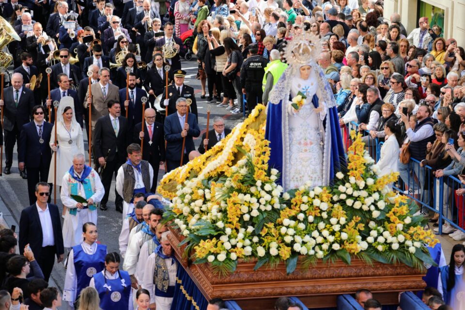 Al salir de la basílica, una colla ha interpretado una composición dedicada a ella, y en su honor se ha bailado una dançà. En el interior del templo ha habido una levantà en recuerdo de José María Lorente Satoca, uno de los fundadores de la hermandad. La procesió ha enfilado la escalinata que da acceso a la calle Jorge Juan a los compases del pasodoble ‘José Ángel Guirao’. Los costaleros han vestido el traje de zaragüells, fajín y pañuelo azul. Las Belleas del Foc, Belén Mora Rosado e Inés Llavador Castelló, y sus Damas de Honor han procesionado con la comitiva. Al mismo tiempo era el Santísimo Cristo Resucitado quien partía desde la Concatedral. En el cortejo han figurado integrantes de las distintas cofradías y hermandades, como ha sido el caso de los costaleros del trono.