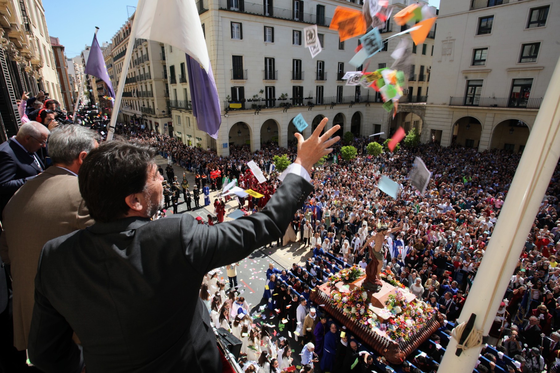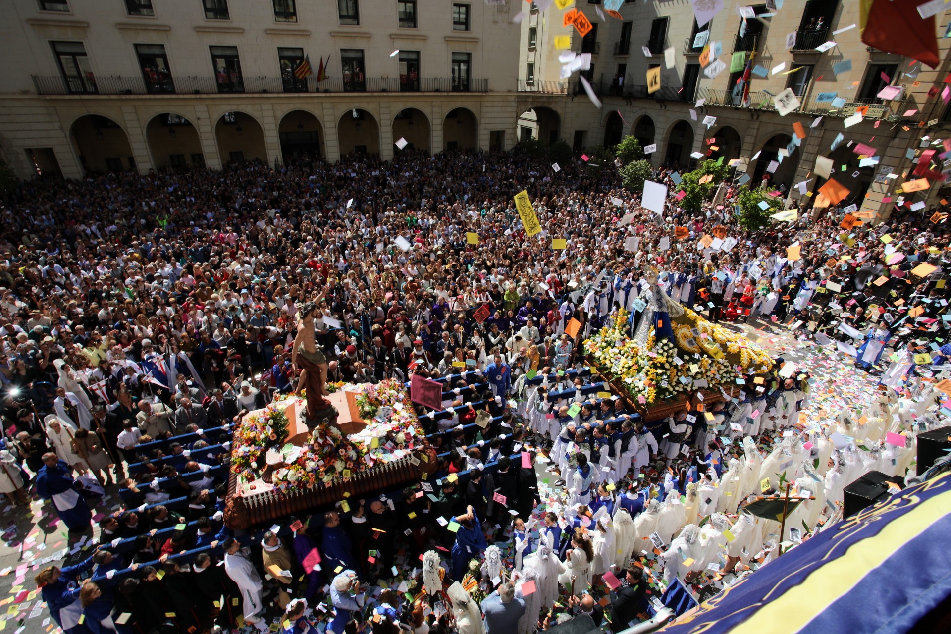Alicante ha cerrado este domingo la Semana Santa con el colofón del emotivo Encuentro entre el Cristo Resucitado y la Virgen de la Alegría, que ha tenido como escenario la Plaza del Ayuntamiento. Cerca de 5.000 personas han abarrotado este escenario y las calles aledañas.