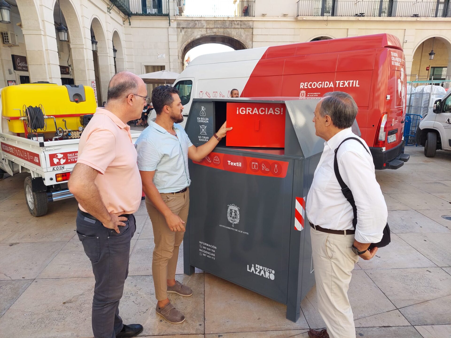 Alicante, 3 de agosto de 2023. Alicante despliega 350 contenedores ‘inteligentes’ para la recogida del residuo textil en la ciudad de Alicante, con motivo de la entrada en funcionamiento del nuevo Servicio de Recogida del Residuo Textil a cargo de la empresa de inserción Proyecto Lázaro. El contrato fue suscrito el pasado 22 de octubre de 2022 para los próximos cuatro años por un importe de 572.009,24 euros. El dispositivo habilitado incorpora además nuevos vehículos recolectores y de apoyo, así como una plataforma inteligente con sensores de control de llenado.
