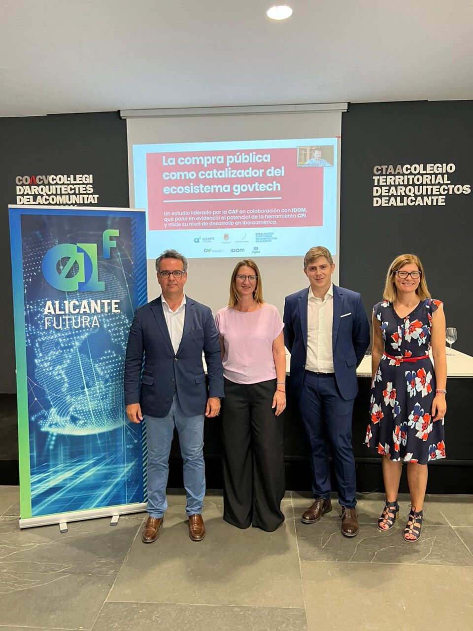 El HUB Govtech de Alicante Futura ha acogido la presentación del estudio ‘La compra pública como catalizadora de ecosistemas Govtech’, una investigación que se da a conocer por primera vez en España. El informe, presentado por el Banco de Desarrollo de América Latina (CAF) e IDOM en el Colegio Territorial de Arquitectos de Alicante, ha sido presidido por la concejala de Empleo y Fomento del Ayuntamiento de Alicante, Mari Carmen de España. Además, la presentación también ha contado con las ponencias de Enrique Zapata, Coordinador de Inteligencia de Datos, Govtech y Gobierno Abierto; Sandra Sinde, directora de CPI e Innovación abierta de IDOM, y Guillermo Mas, director de innovación en AGBAR.