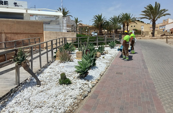 También se lleva a cabo antes de iniciarse la temporada veraniega, de forma paralela a la adaptación de los parterres, una actuación de desbroce y limpieza de márgenes para eliminar las proliferaciones de hierbas con el objetivo de que la isla presente su mejor imagen.
