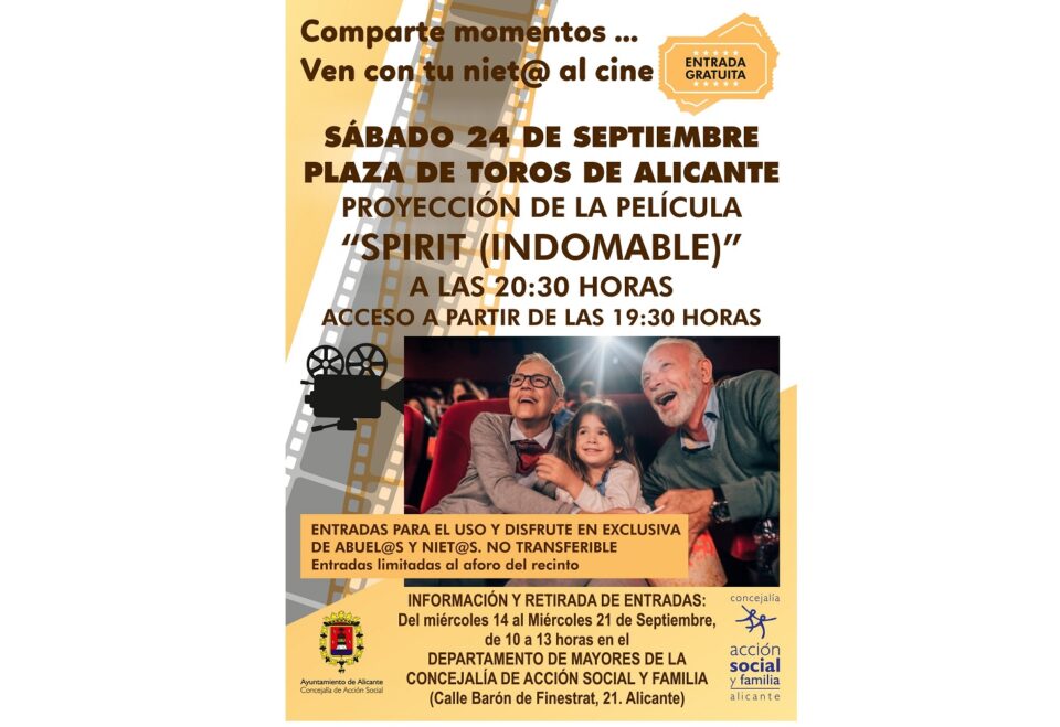 Alicante, 13 de septiembre de 2022. El Ayuntamiento de Alicante, a través de la concejalía de Acción social y Familia, invita a la actividad “Comparte momentos, ven con tu niet@ al cine” dirigida a abuelos y nietos con el objetivo de acercar la oferta cultural de la ciudad a las personas mayores y darles la oportunidad de estrechar vínculos con sus nietos.