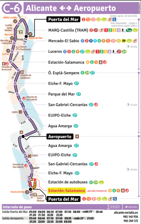 La línea C6 tiene su cabecera en la Puerta del Mar y realiza paradas en el MARQ, Mercado Central, plaza de los Luceros, avenidas de Salamanca, Óscar Esplá y Federico Mayo, Parque del Mar, San Gabriel, Euipo, Agua Amarga y Aeropuerto. Cabe señalar que el autobús mantiene una conexión directa del aeropuerto con la estación de Renfe. Al mismo tiempo, la empresa concesionaria mantiene el servicio con tres unidades, a la que se podría añadir una cuarta en caso necesario.