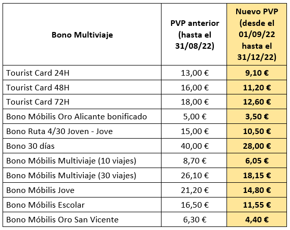 Alicante,1 de septiembre de 2022. Alicante reduce el precio de los abonos y títulos multiviaje del transporte público colectivo en autobús, englobado en el sistema TAM, en un 30% acogiéndose a las ayudas aprobadas por el Ministerio de Transporte, Movilidad y Agenda Urbana para el periodo comprendido entre este jueves, 1 de septiembre y el 31 de diciembre, aunque los títulos adquiridos en este periodo se podrán usar hasta el 31 enero de 2023 en respuesta a las consecuencias económicas y sociales de la guerra de Ucrania.