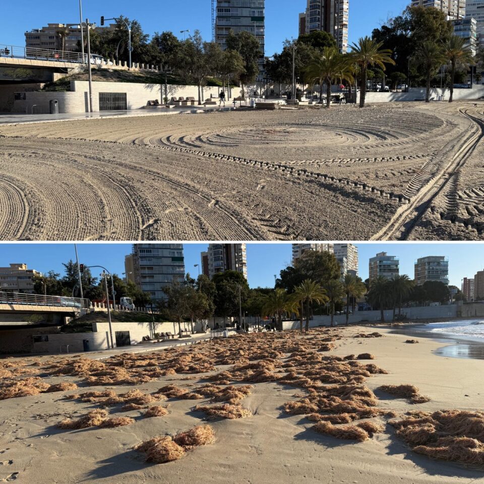 Especialmente intensa ha sido la labor de los tractores desarrollada en la playa de la Albufereta para recuperar la arena perdida por los arrastres procedentes del barranco del Juncaret-Orgegia, como acostumbra en este punto, aportando arena devuelta por el mar para rellenar el surco causado por la corriente.