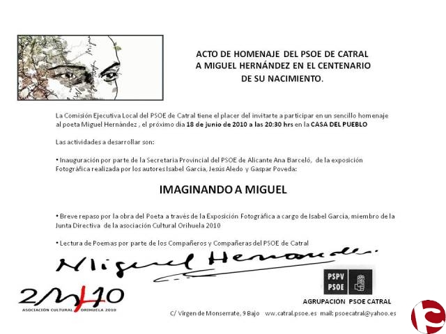 La líder de los socialistas alicantinos, Ana Barceló, inaugurará la exposición “Imaginando a Miguel” el próximo viernes 18 a las 20.30 horas en la Casa del Pueblo de Catral. Los actos de homenaje al escritor alicantino está organizado por la Comisión Ejecutiva local del PSPV-PSOE y consisten en la exposición fotográfica de autores como Isabel García, Jesús Aledo y Gaspar Poveda. A continuación, algunos compañeros de partido leerán poemas del escritor, al que se unirá la participación de Ana Barceló que recitará uno de ellos.