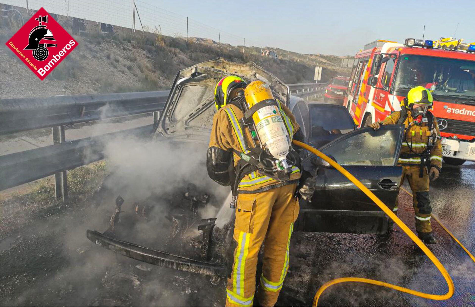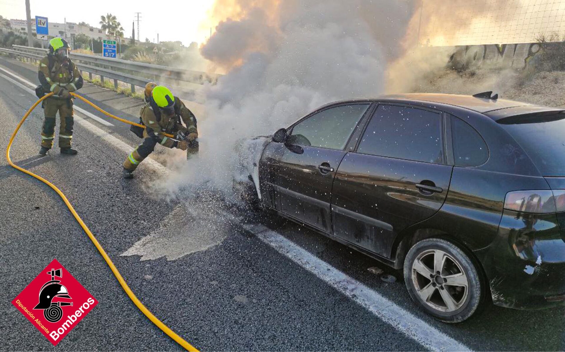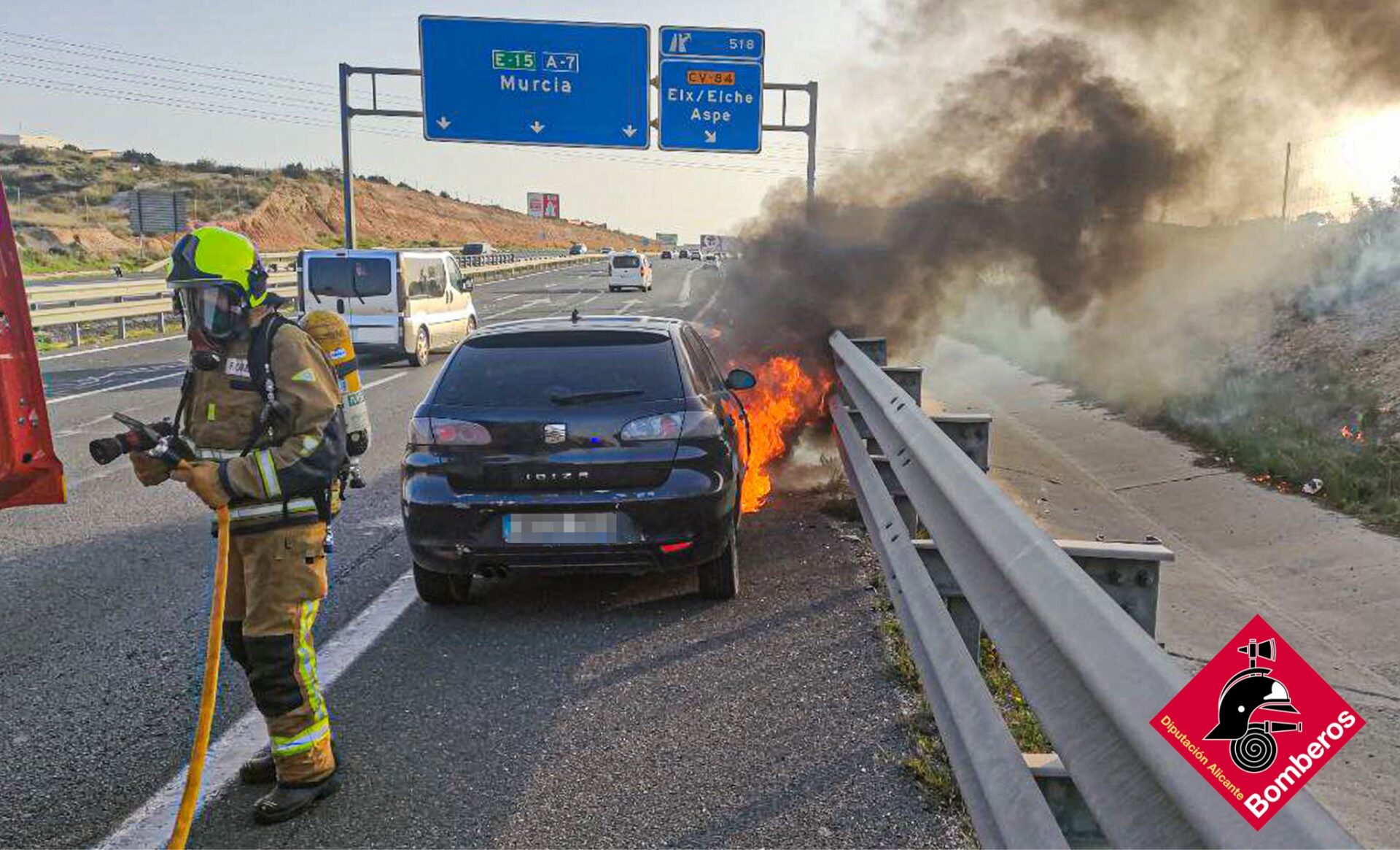 En la tarde de ayer, sábado 16 de abril, los Bomberos de la Diputación de Alicante intervenían en el incendio de un vehículo en la autovía A-7 a la altura de Elche, cerca de la salida hacia Aspe. Por fortuna, no se registraron heridos.