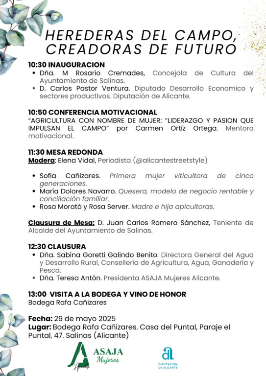 Por ello celebrará una jornada este jueves 29 de mayo en Salinas, con varios bloques que incluyen una conferencia motivacional y una mesa redonda. En esta última participarán cuatro mujeres emprendedoras, ejemplos de liderazgo y conciliación de su vida familiar con la actividad agraria. Ella son: Sofía Cañizares (la primera mujer de cinco generaciones de viticultores, enóloga y con un vino propio que lleva su nombre), Rosa Morató y Rosa Server (madre e hija apicultoras, agricultoras y emprendedoras en venta de miel, así como en experiencias) y María Dolores Navarro (desde la pandemia supo aprovechar la leche de caprino de la ganadería de su marido para montar una quesería propia).