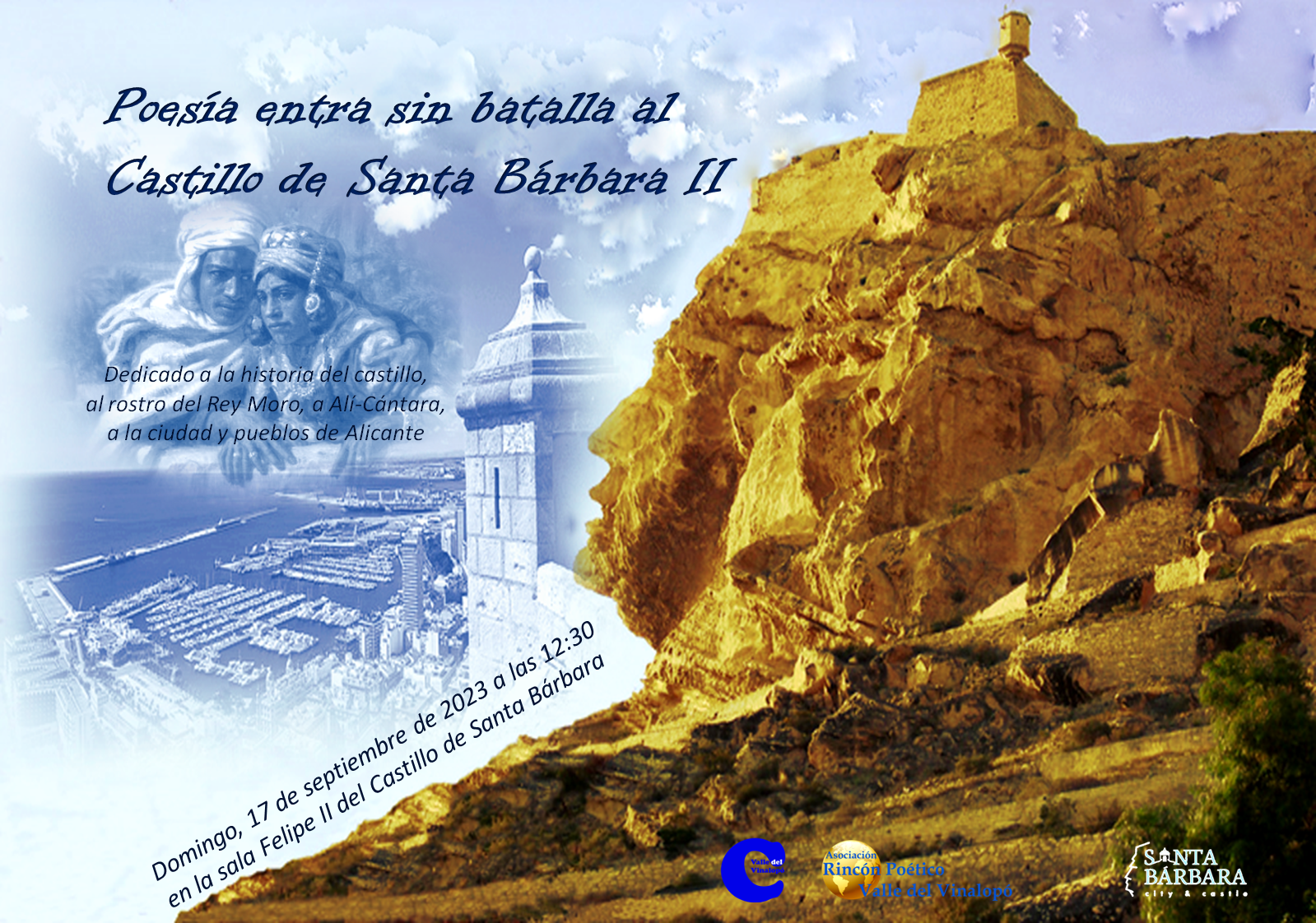 De nuevo entramos con la poesía al Castillo de Santa Bárbara con poetas y rapsodas del valle y comarca alicantina de la Asociación Rincón Poético Valle del Vinalopó, donde realizaremos con la coordinación de su presidenta Lucía Pastor, un recital poético musical en la sala Felipe II del Castillo Santa Bárbara en Alicante, a las 12:30 horas del domingo 17 de septiembre del 2023, dando a conocer con sus textos poéticos la historia del castillo, el rostro del Rey Moro, el romance de Alí-Cántara, la ciudad y pueblos de Alicante.