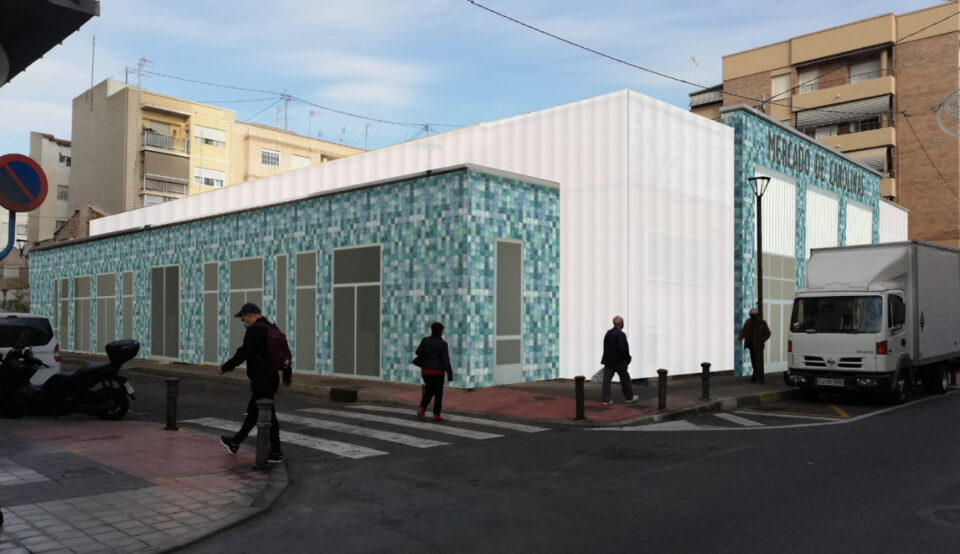 Los trabajos de rehabilitación del Mercado Municipal de Carolinas que ha impulsado el Ayuntamiento de Alicante están avanzados, y ya se deja ver cómo quedará la remodelación de su fachada con una imagen más moderna de este recinto municipal que data del año 1958.