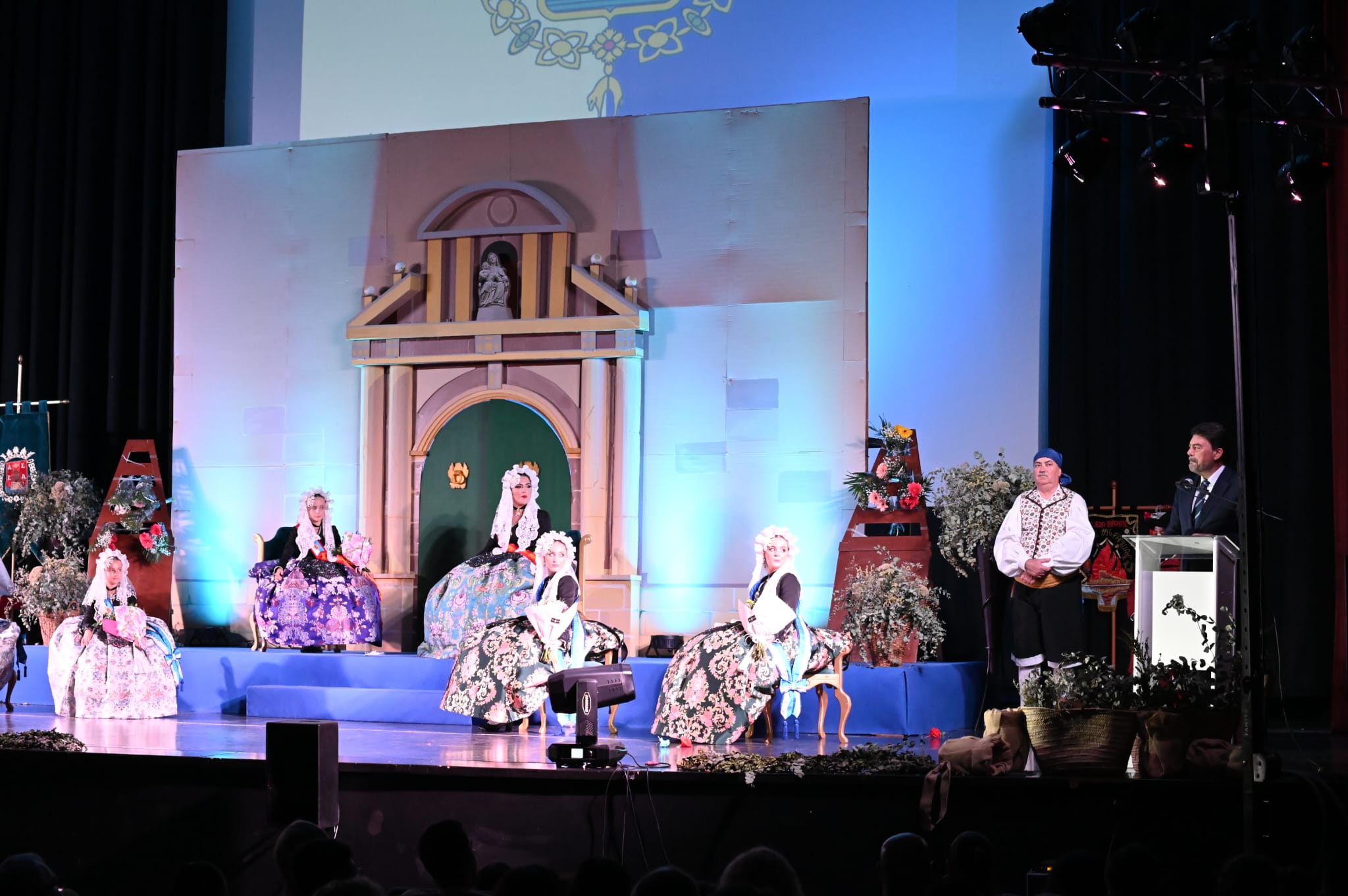 “Yo sentí la llamada” ha sido el lema del espectáculo de proclamación que se ha desarrollado en el salón de acto del Hogar Provincial “Antonio Fernández Valenzuela”. En él, y con una reproducción de la fachada de la Concatedral de San Nicolás, se han escenificado momentos de la Ofrenda a la Patrona. También, y en un emotivo vídeo, se han proyectado imágenes de foguerers, barraquers y festeros fallecidos durante la pandemia.