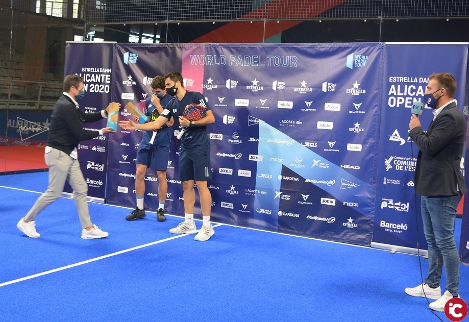 Alicante, 8 de noviembre de 2020. La pareja formada por Alejandro Galán y Juan Lebrón, de España, se ha proclamado a primera hora de la tarde campeona del torneo de pádel Estrella Damm Alicante Open, que forma parte del circuito profesional World Padel Tour (WPT). Unas horas antes, en la misma principal del Centro de Tecnificación, las jugadoras Gemma Triay y Lucía Sáinz se alzaban con el trofeo como mejor pareja de la ronda femenina.