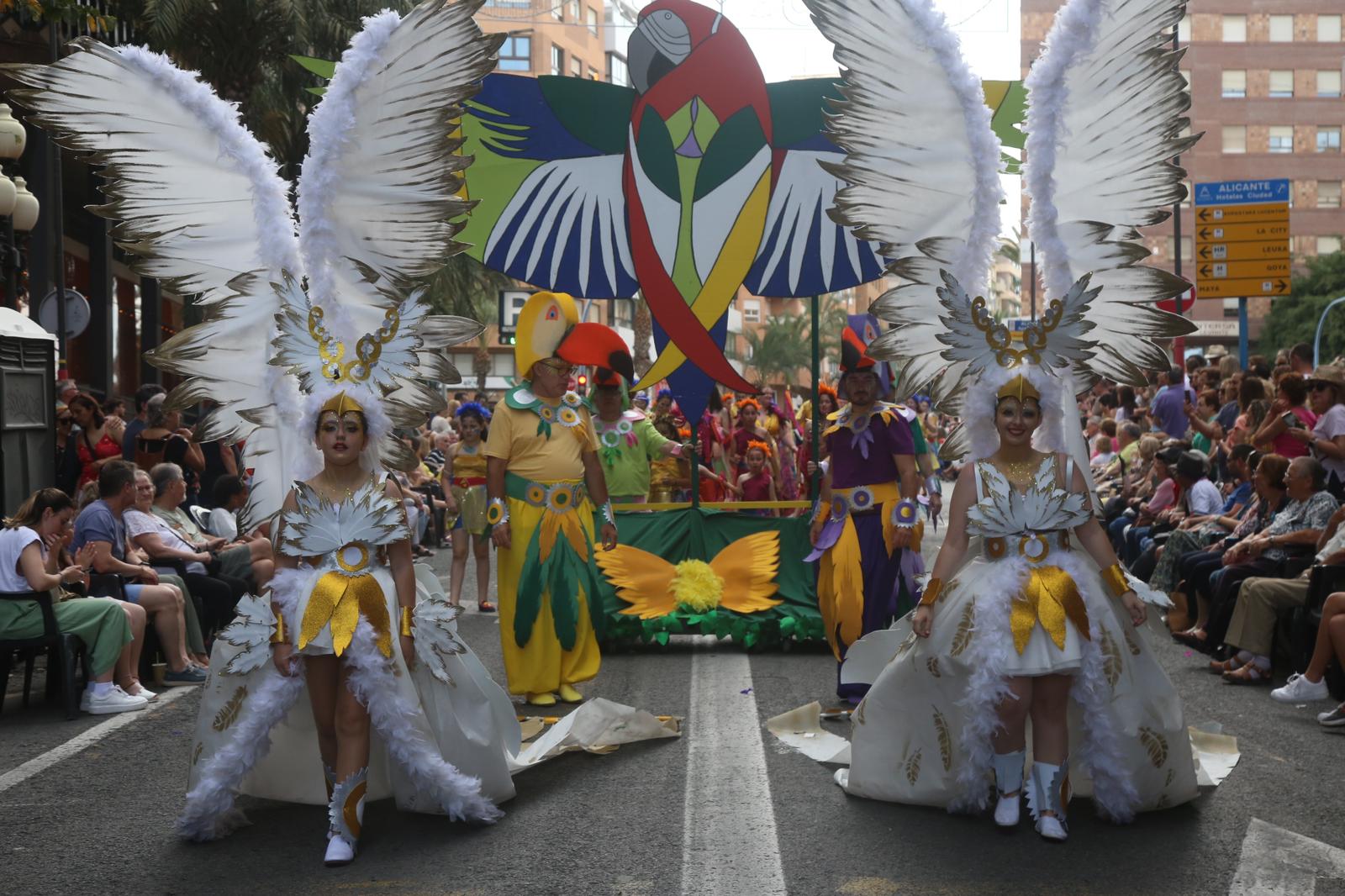 La naturaleza, el circo, el mar o las tradiciones e historia de otros lugares fueron algunas de las temáticas que se pudieron ver ayer en el desfile más desenfadado de las fiestas, donde no faltaron paradas en tribuna para entregar regalos a las belleses del foc d’Alacant y sus dames d’honor.