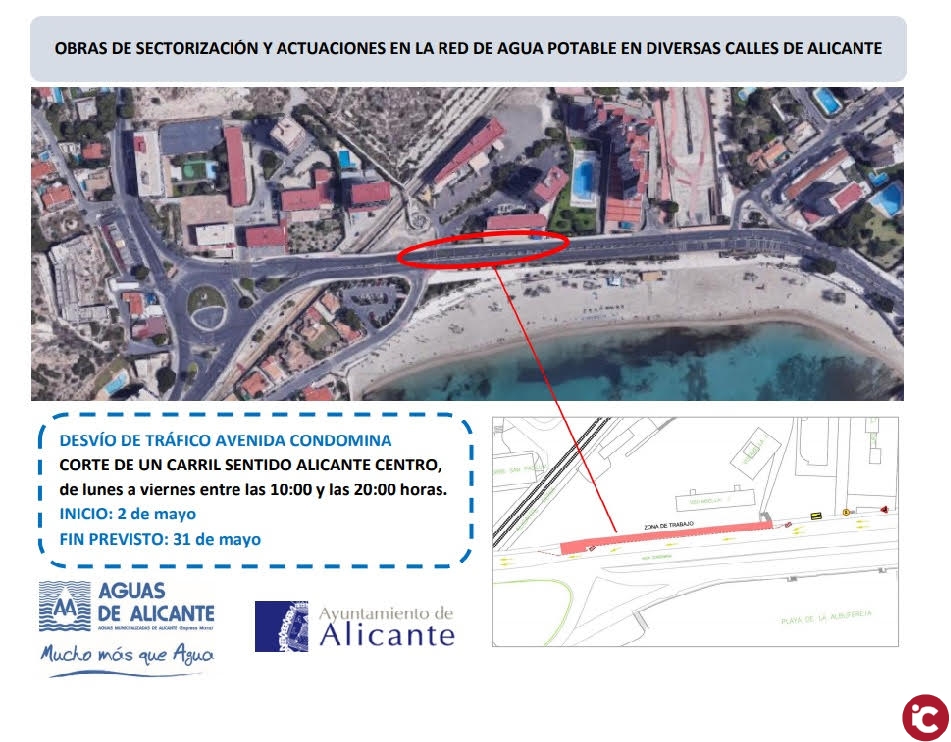 COMUNICADO DE PRENSA. Alicante a 27 de Abril del 2017. La Concejalía de Movilidad y Accesibilidad del Ayuntamiento de Alicante informa que a partir del próximo miércoles – 2 de mayo- se va a ocupar un tramo del carril derecho en la Avenida Condomina antes de la intersección con la Isleta, dirección centro ciudad desviando el tráfico por el carril izquierdo, con motivo de las obras realizadas por Aguas de Alicante de sectorización y actuaciones en la red de agua potable en diversas calles y el sector Cabo de las Huertas.