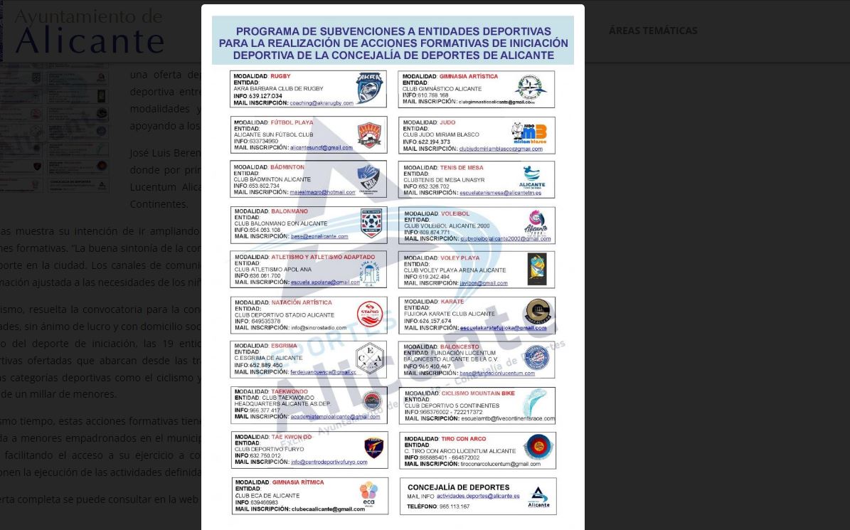 Así mismo, resuelta la convocatoria para la concesión de subvenciones a clubes deportivos y secciones deportivas de otras entidades, sin ánimo de lucro y con domicilio social en el municipio de Alicante, para la realización de acciones formativas en el ámbito del deporte de iniciación, las 19 entidades seleccionadas serán las responsables de gestionar las modalidades deportivas ofertadas que abarcan desde las tradicionales como atletismo, baloncesto, bádminton y balonmano hasta las nuevas categorías deportivas como el ciclismo y el tiro con arco, lo que permitirá que estas acciones formativas alcancen a cerca de un millar de menores.