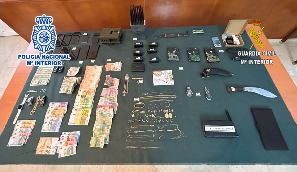 En los registros, se incautaron 7 relojes de alta gama, 14 dispositivos móviles, 1 inhibidor de frecuencia, 68 piezas de joyería de oro, 4.280 euros y billetes de otras otros países, tarjetas bancarias y de telefonía móvil, 7 balizas, 1 kit de reactivos para comprobar metales preciosos, 1 tester para verificar la dureza de piedras preciosas, dos vehículos a motor, uno de ellos de alta gama, y documentos de identidad rumanos presuntamente falsificados.