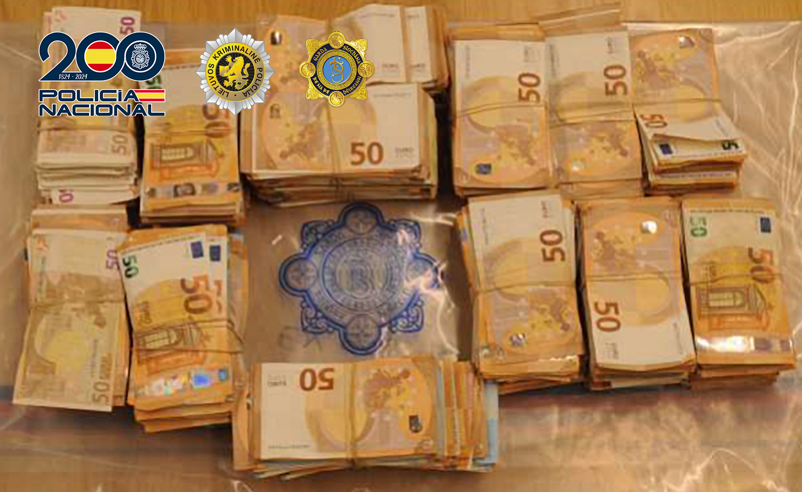 Agentes de la Policía Nacional han participado en una operación internacional, junto con las policías de Lituania e Irlanda, en la que se ha desarticulado una organización criminal presuntamente vinculada con el mayor alijo de cocaína realizado en Europa, 16 toneladas de cocaína intervenidas en el Puerto de Hamburgo en 2021. Los narcotraficantes introducían en Europa cocaína procedente de Sudamérica, hachís desde Marruecos y marihuana adquirida en nuestro país. Han sido detenidas nueve personas en España (1), Lituania (7) e Irlanda (1) y se han realizado varios registros en los que se han intervenido más de 2.000.000 de euros en efectivo, siete armas de fuego, 103 kilos de marihuana, detectores de GPS, móviles encriptados y diversa documentación.