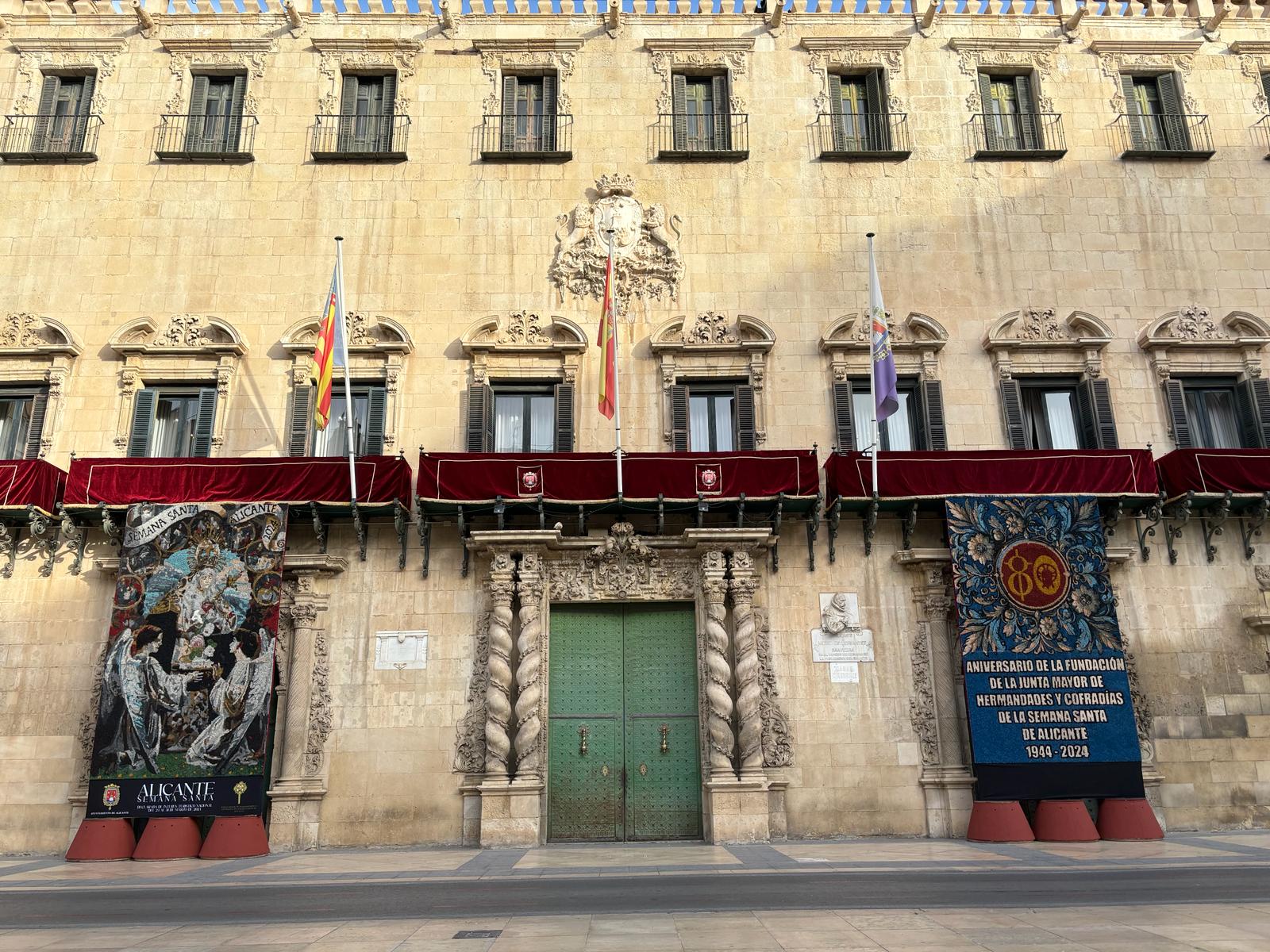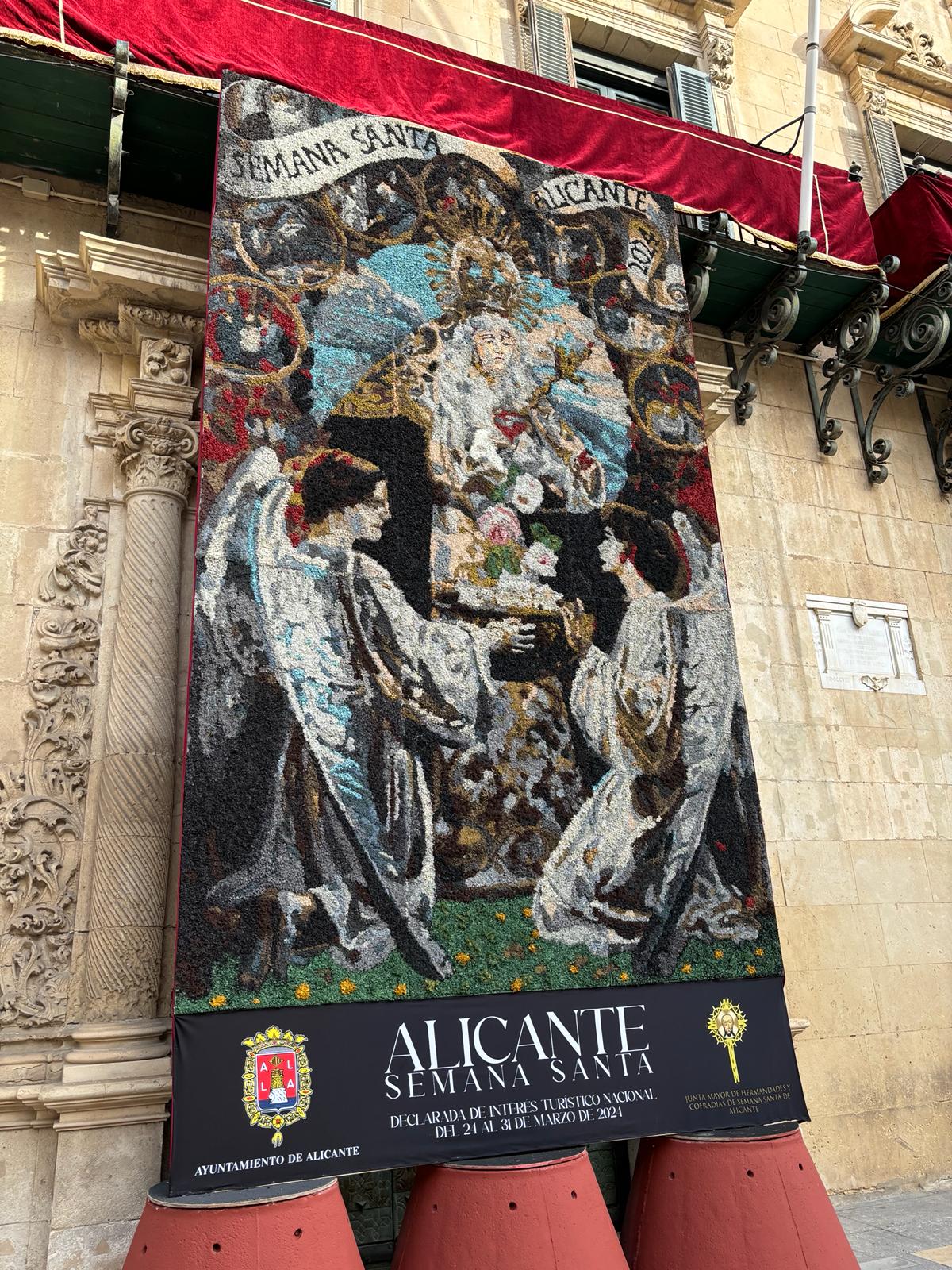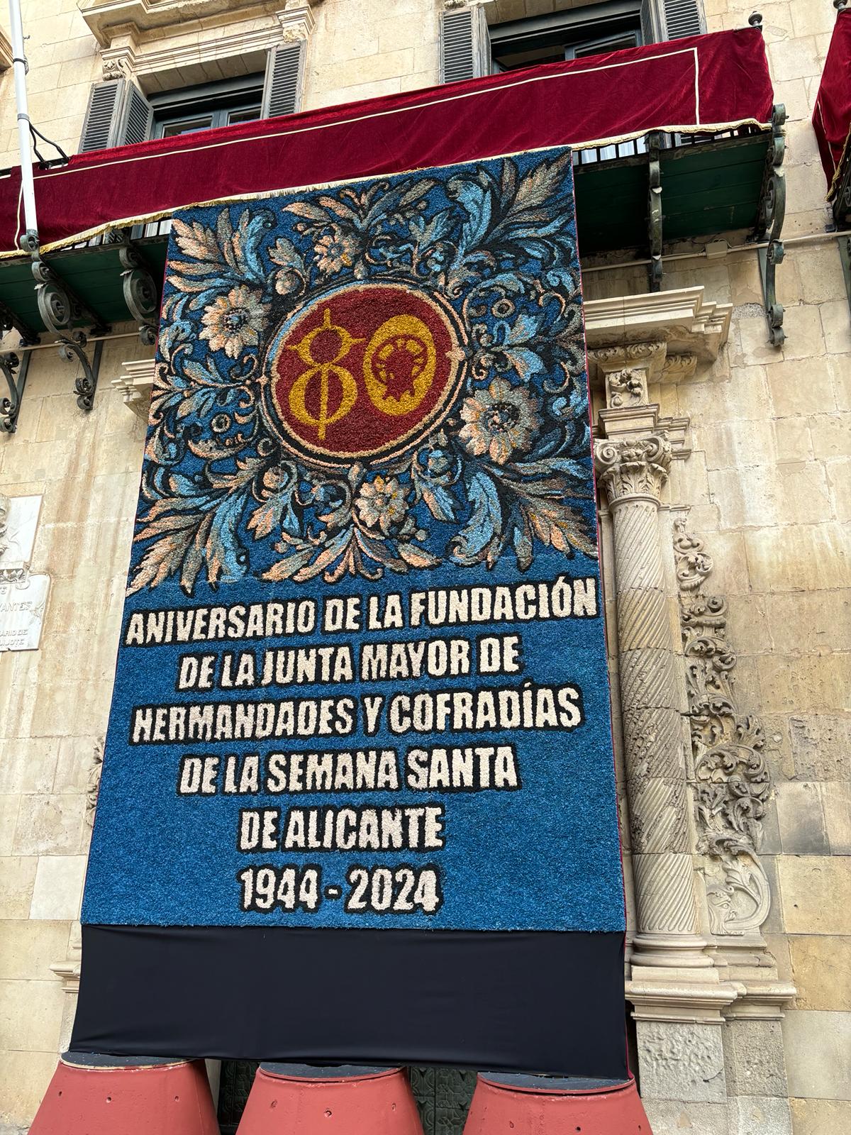 Dos tapices de flores anuncian desde la tarde de este jueves en la fachada principal del Ayuntamiento de Alicante la llegada de la Semana Santa. El doble ornamento, compuesto por ochenta kilos de flores, refleja el 80 aniversario de la fundación de la Junta Mayor de Hermandades y Cofradías, y el cartel anunciador de las celebraciones de este año, original del sevillano Pedro Castro.