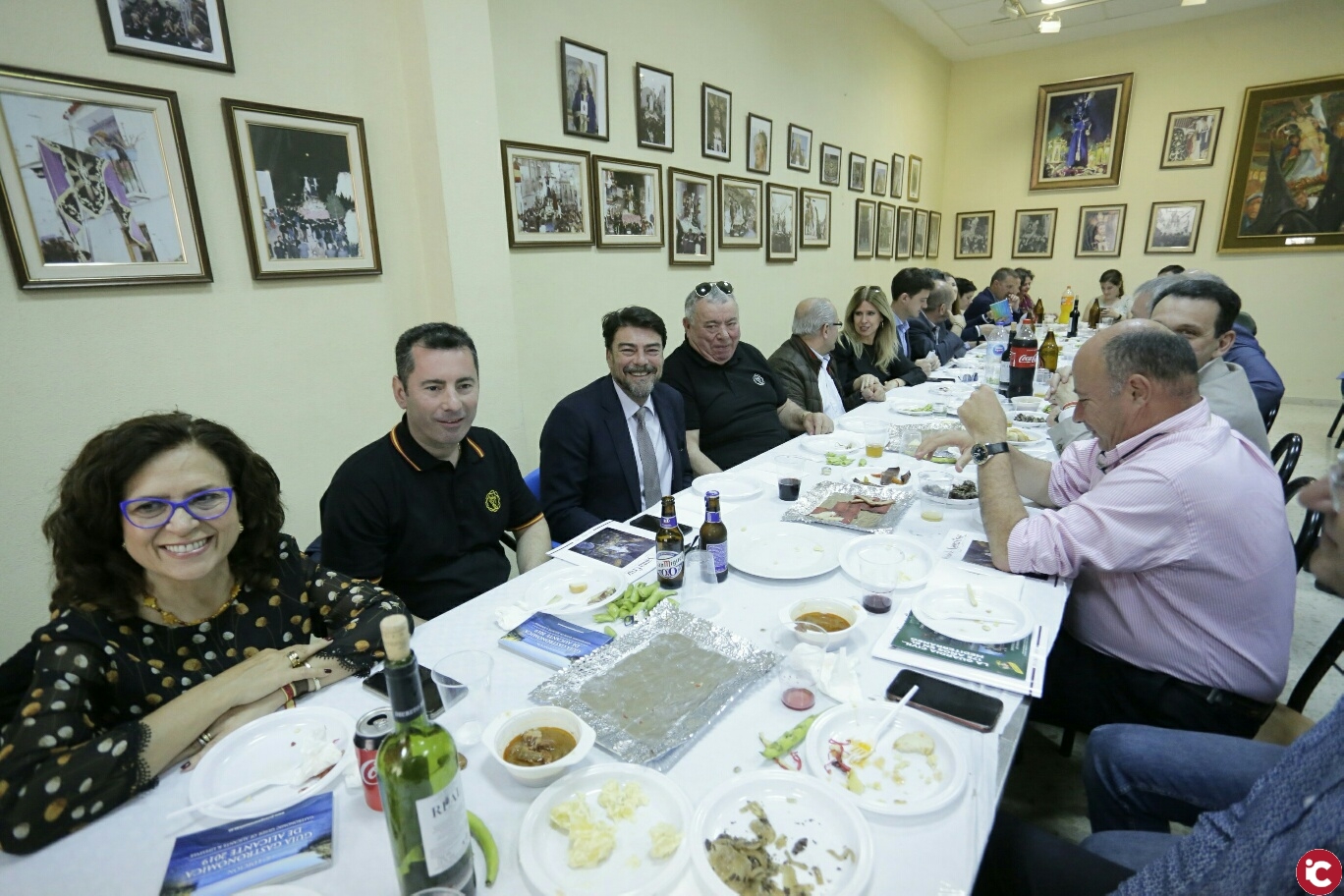 El alcalde de Alicante, Luis Barcala, ha asistido este miércoles Santo al tradicional almuerzo de la Hermandad Penitencial de la Santa Cruz, que preside, Ramón Riquelme, junto con los costaleros y las autoridades en su sede, donde ha destacado que hoy es el día de Santa Cruz que se encuentra en estado puro, lleno de gente esperando para esta tarde poder disfrutar de sus procesiones en estas estrechas calles y compartir con ellos este momento para poner a Alicante en lo más alto.