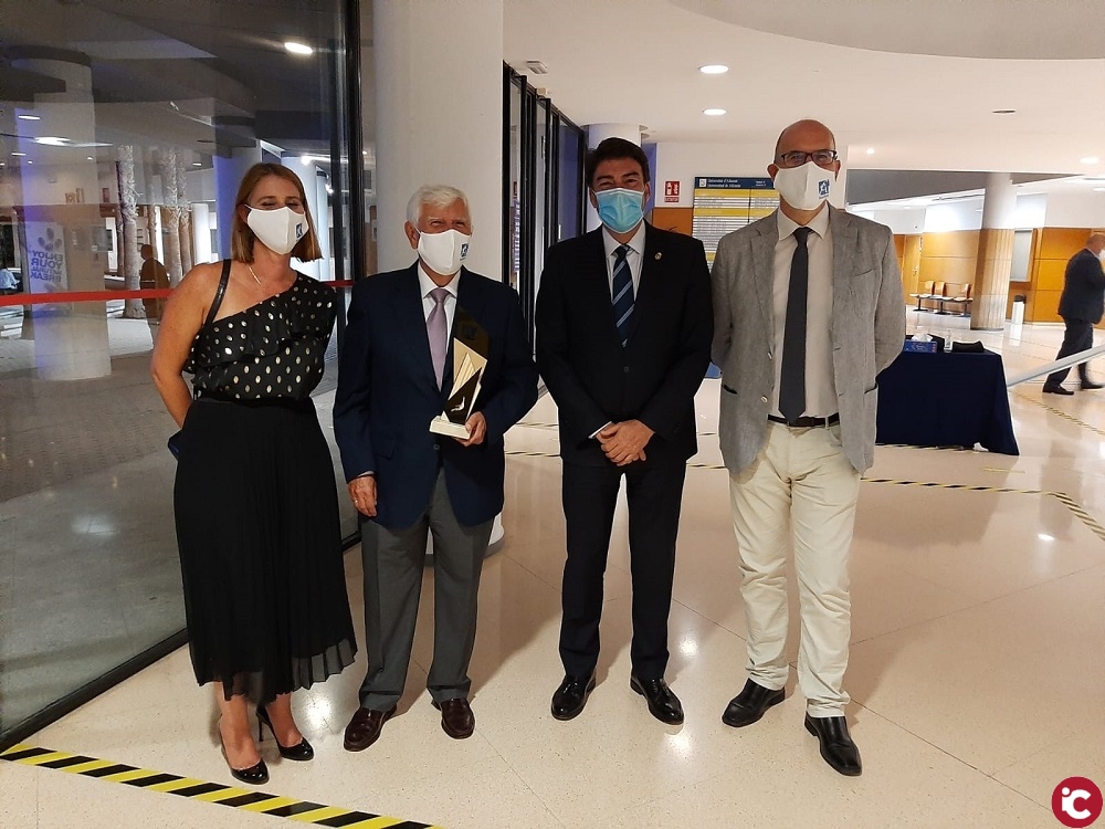 Alicante, 11 de septiembre de 2020. El alcalde de Alicante, Luis Barcala, ha entregado esta noche el reconocimiento a la responsabilidad social corporativa a Esatur que otorga la Agencia de Desarollo Local ‘ImpulsAlicante’ en los XXVI Premios Fundeun a las Nuevas Ideas Innovadoras, en el anfiteatro del Aulario II. Barcala ha hecho entrega de la estatuilla junto a la concejala delegada de la ADL, Mari Carmen de España, al representante de la mercantil, José Trigueros. Al acto también asistió por el ayuntamiento de Alicante el concejal de Medio Ambiente, Manuel Villar.