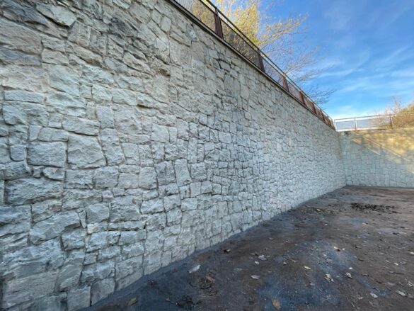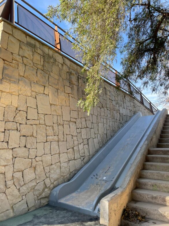 Alicante, 30 de diciembre de 2022. El departamento de Limpieza Viaria y Gestión de Residuos ha puesto en marcha una operación de limpieza de pintadas en los muros empedrados que soportan las laderas del parque del Monte Tossal, junto a la zona de juegos infantiles. Los técnicos municipales están probando una nueva técnica que permite recuperar el estado natural de la piedra y, de esta forma, evitar otras técnicas como la de pintar sobre las pintadas para taparlas.