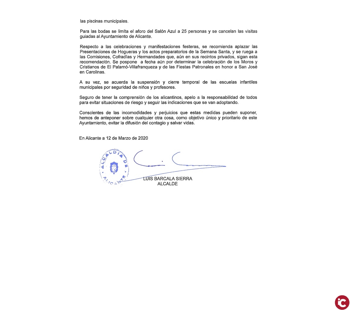 El alcalde, en el bando considera que ante la evolución de la actual situación sanitaria por el coronavirus en toda España, el Ayuntamiento de Alicante está obligado a poner en marcha con carácter inmediato una serie de medidas que alcanzan a todos los servicios municipales y a toda la población alicantina y que se toman para evitar la propagación del virus.