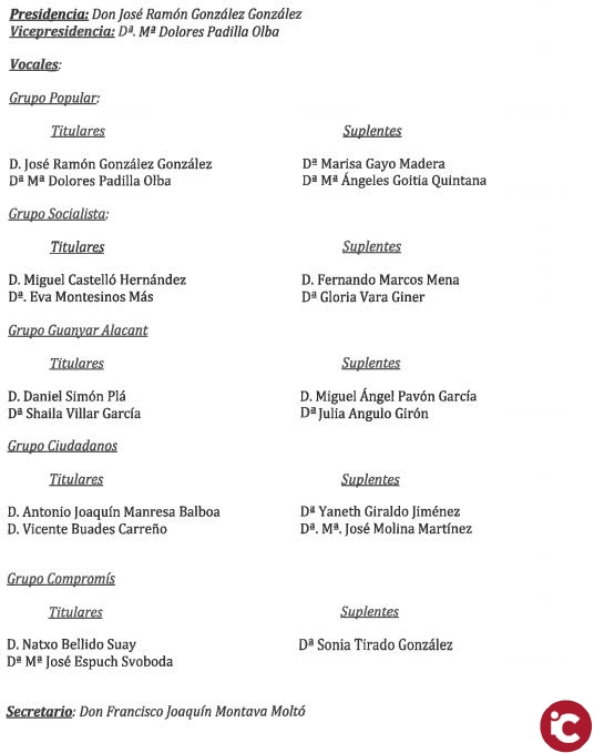 Esta Comisión ha sido creada por decreto de alcaldía y se ha constituido con dos concejales de cada uno de los grupos políticos de PP, PSOE, Grupo Guanyar, Ciudadanos y Compromis, con sesiones que son de carácter público.