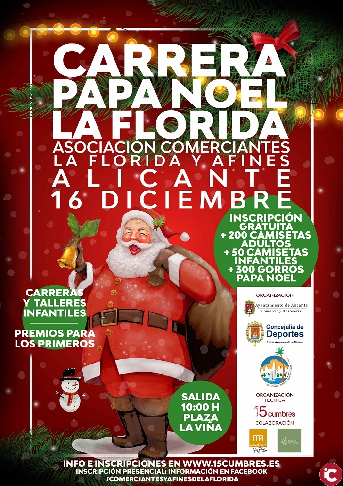 La Asociación de Comerciantes de la Florida y Afines, junto con 15 Cumbres y el área de Deportes del Ayuntamiento en colaboración con Mercalicante y Di-Fruta, han organizado para el próximo 16 de diciembre la Carrera Papá Noel La Florida para adultos y niños. Los participantes podrán realizar la carrera corriendo o andando, en grupo o a solas.