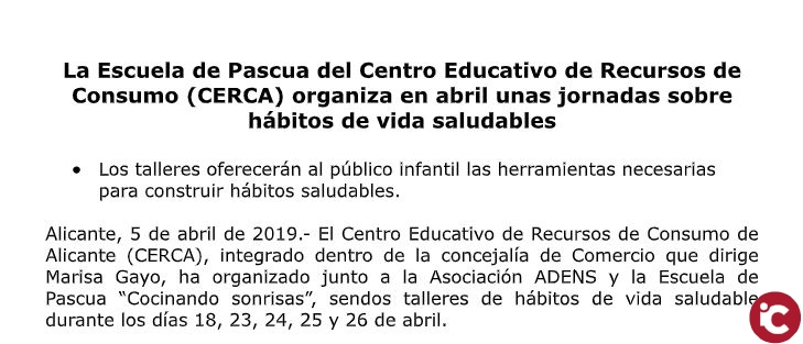 Alicante, 6 de abril de 2019.- El Centro Educativo de Recursos de Consumo de Alicante (CERCA), integrado dentro de la concejalía de Comercio que dirige Marisa Gayo, ha organizado junto a la Asociación ADENS y la Escuela de Pascua Cocinando sonrisas, sendos talleres de hábitos de vida saludable durante los días 18, 23, 24, 25 y 26 de abril.