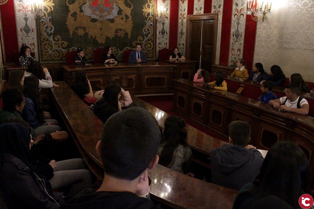FOTONOTICIA. Alicante, 4 de abril de 2019. Los concejales de Coordinación de Proyectos María Dolores Padilla, y de Juventud, Israel Cortés, han recibido hoy en el Salón Azul del Ayuntamiento a casi medio centenar de alumnos y profesores mediadores de institutos de Enseñanza Secundaria Virgen del Remedio, Leonardo da Vinci, Gran Vía 4 y Las Lomas de Juan XXIII.