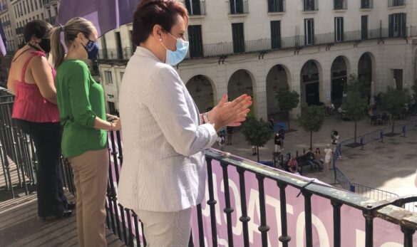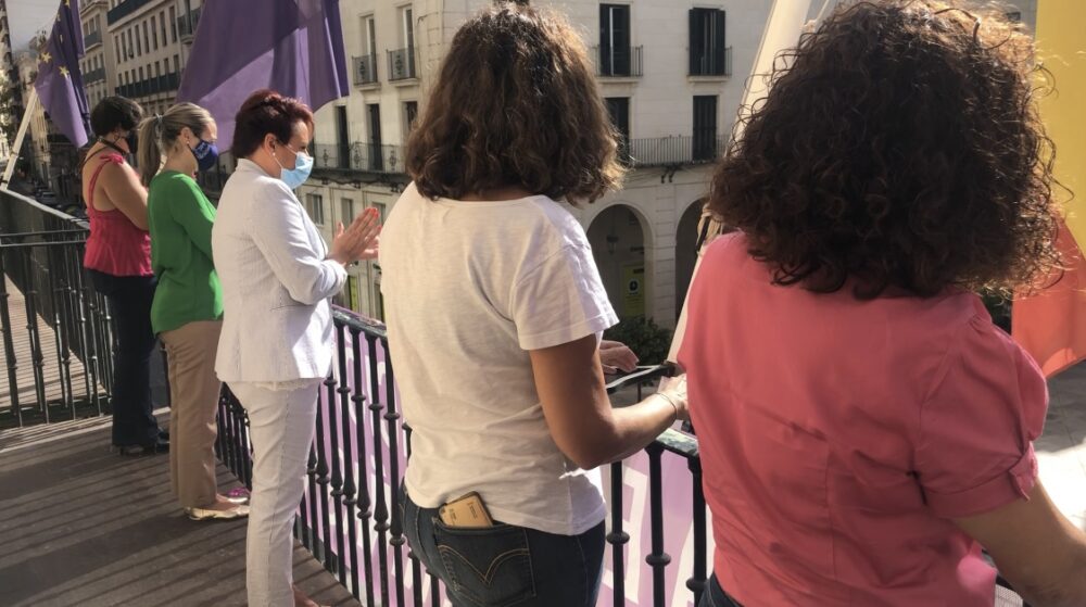 Alicante, 23 de septiembre de 2021.- La concejala de Igualdad, María Conejero y la concejala de Hacienda, Lidia López junto con otros integrantes de la corporación municipal, se ha sumado a la conmemoración del Día Internacional contra la Explotación Sexual y el tráfico de mujeres, niñas y niños. El Consistorio ha colgado una pancarta conmemorativa en la fachada para mostrar su solidaridad con esta causa.