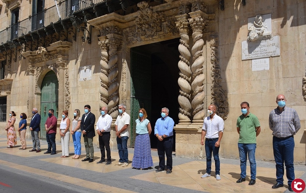 La Corporación Municipal ha guardado este martes un minuto de silencio a las puertas del Ayuntamiento de Alicante en señal de condena por el asesinato machista de una mujer en Burriana el pasado 21 de abril.